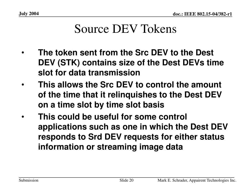 Source DEV Tokens • The token sent from the Src DEV to the Dest DEV (STK) contains size of the Dest DEVs time slot for data transmission • This allows the Src DEV to control the amount of the time that it relinquishes to the Dest DEV on a time slot by time slot basis • This could be useful for some control applications such as one in which the Dest DEV responds to Srd DEV requests for either status information or streaming image data Mark E. Schrader, Appairent Technologies Inc.