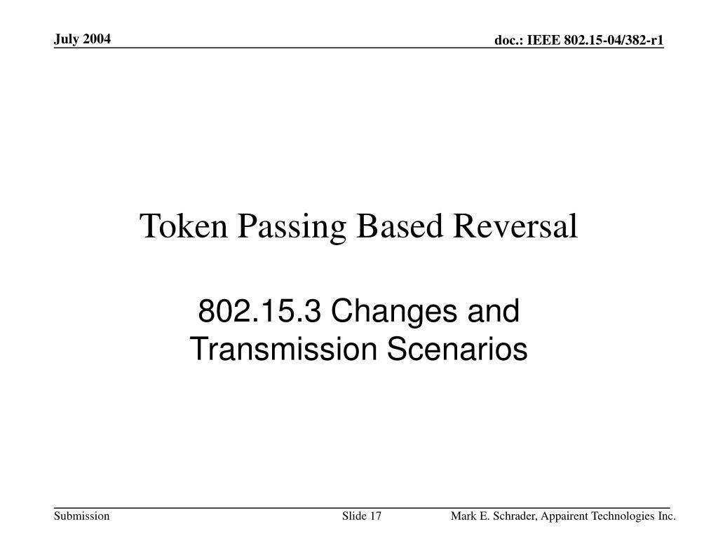 Token Passing Based Reversal 802.15.3 Changes and Transmission Scenarios Mark E. Schrader, Appairent Technologies Inc.