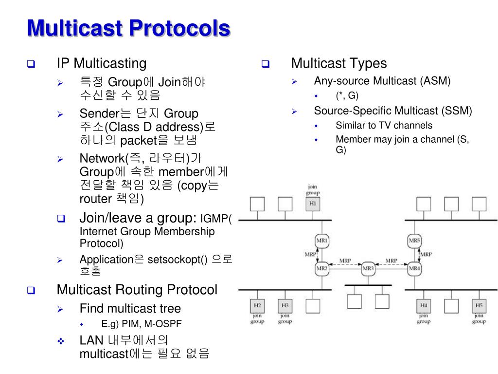 IP Multicasting 특정 Group에 Join해야 수신할 수 있음 Sender는 단지 Group 주소(Class D address)로 하나의 packet을 보냄 Network(즉, 라우터)가 Group에속한 member에게 전달할 책임 있음 (copy는 router 책임) Join/leave a group: IGMP( Internet Group Membership Protocol) Application은 setsockopt() 으로 호출 Multicast Routing Protocol Find multicast tree E.g) PIM, M-OSPF LAN 내부에서의 multicast에는 필요 없음 Multicast Types Any-source Multicast (ASM) (*, G) Source-Specific Multicast (SSM) Similar to TV channels Member may join a channel (S, G) Multicast Protocols