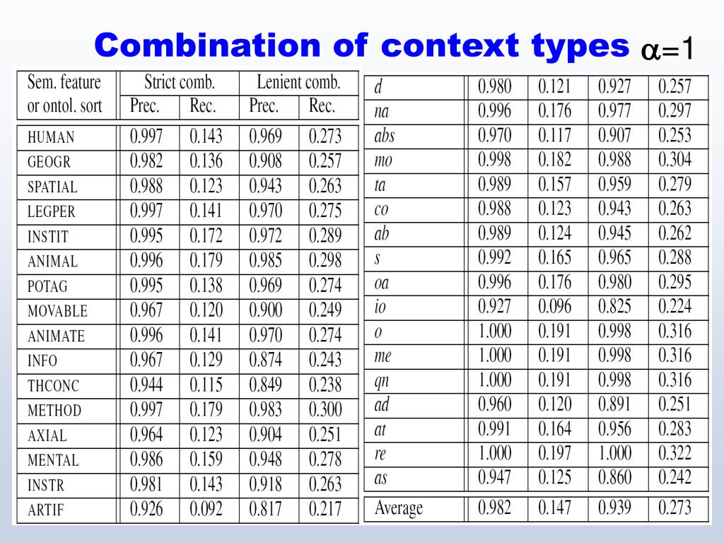 From binary classes to complex sorts • Binary classifiers for single features for all three context element types are combined into one feature assignment: • Lenient: voting • Strict: all classifiers for different context types agree • Combining the outcome: safe choices ANIMAL +/- ANIMATE +/- Selection: compatible complex sorts that are minimal w.r.t hierarchy and unambiguous. ARTIF +/- AXIAL +/- result classorreject ... (16 features) ab +/- abs +/- ad +/- as +/- ... (17 sorts)
