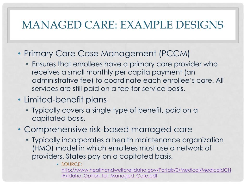 Managed Care: Example Designs • Primary Care Case Management (PCCM) • Ensures that enrollees have a primary care provider who receives a small monthly per capita payment (an administrative fee) to coordinate each enrollee’s care. All services are still paid on a fee-for-service basis. • Limited-benefit plans • Typically covers a single type of benefit, paid on a capitated basis. • Comprehensive risk-based managed care • Typically incorporates a health maintenance organization (HMO) model in which enrollees must use a network of providers. States pay on a capitated basis. • SOURCE: http://www.healthandwelfare.idaho.gov/Portals/0/Medical/MedicaidCHIP/Idaho_Option_for_Managed_Care.pdf