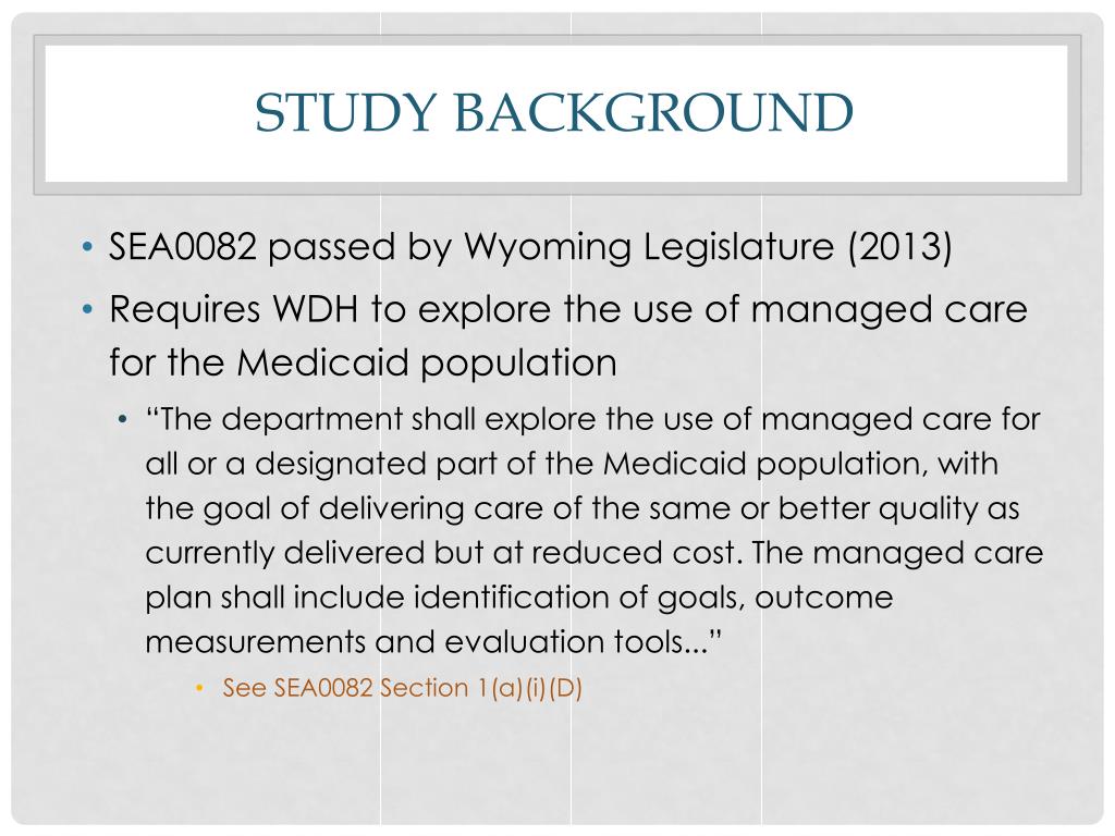 Medicaid Reform Managed Care Study . Interim Update. May 2013. Study Background. SEA0082 passed by Wyoming Legislature (2013) Requires WDH to explore the use of managed care for the Medicaid population