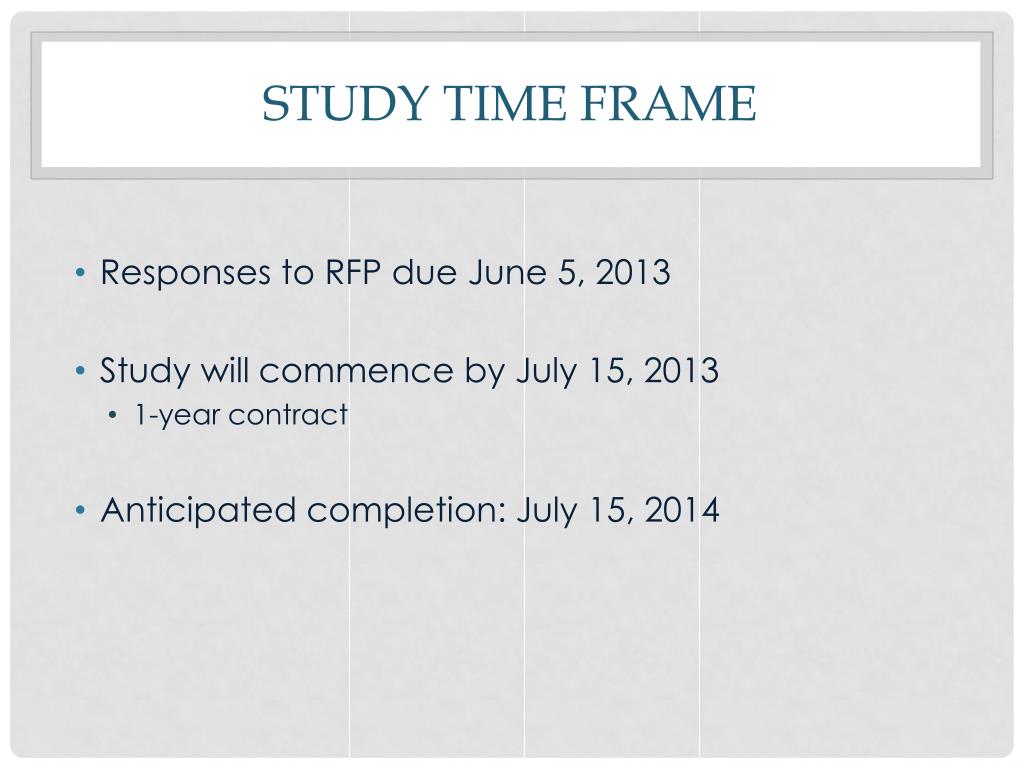 Study Time Frame • Responses to RFP due June 5, 2013 • Study will commence by July 15, 2013 • 1-year contract • Anticipated completion: July 15, 2014