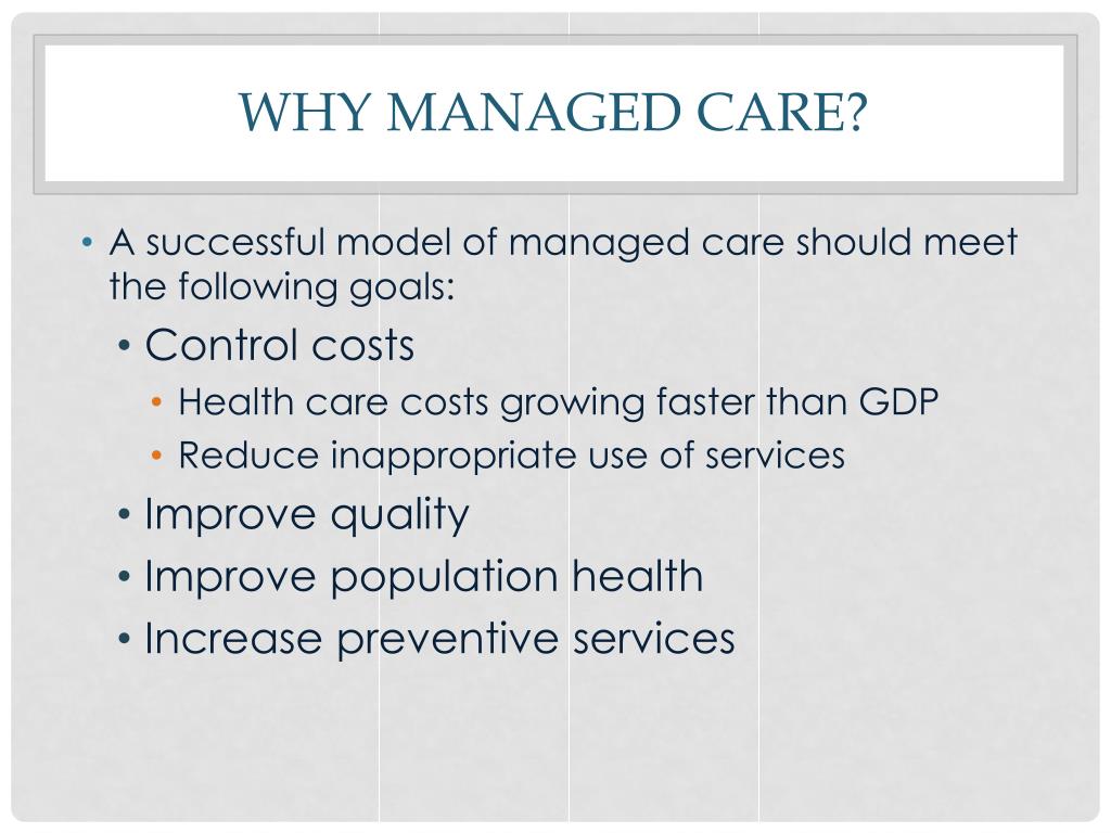 Why Managed Care? • A successful model of managed care should meet the following goals: • Control costs • Health care costs growing faster than GDP • Reduce inappropriate use of services • Improve quality • Improve population health • Increase preventive services