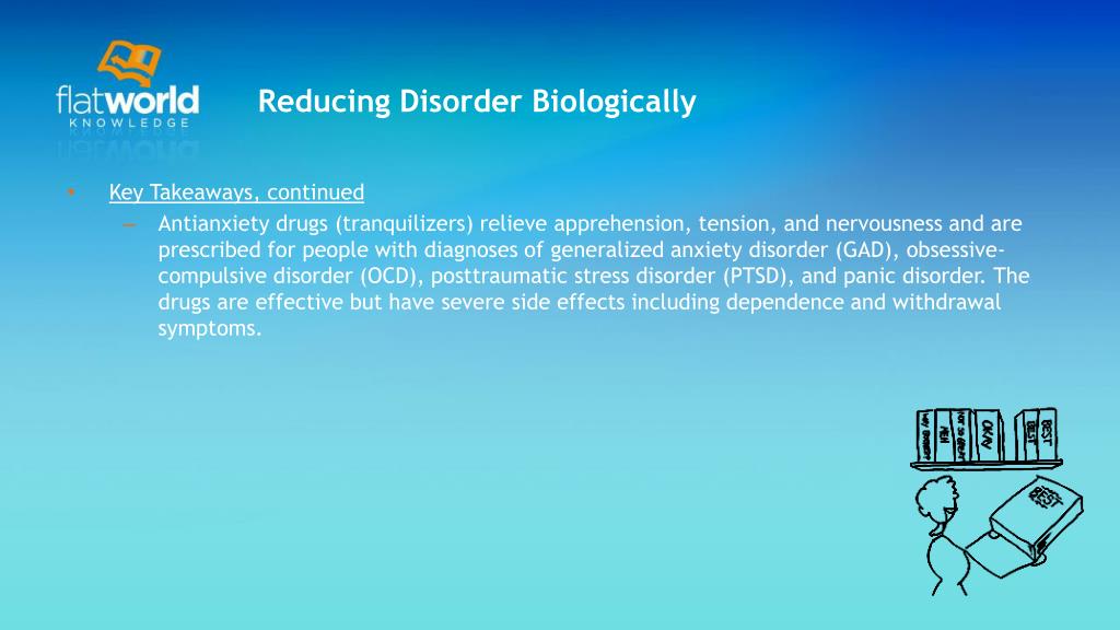 Reducing Disorder Biologically • Key Takeaways, continued • Antianxiety drugs (tranquilizers) relieve apprehension, tension, and nervousness and are prescribed for people with diagnoses of generalized anxiety disorder (GAD), obsessive-compulsive disorder (OCD), posttraumatic stress disorder (PTSD), and panic disorder. The drugs are effective but have severe side effects including dependence and withdrawal symptoms.