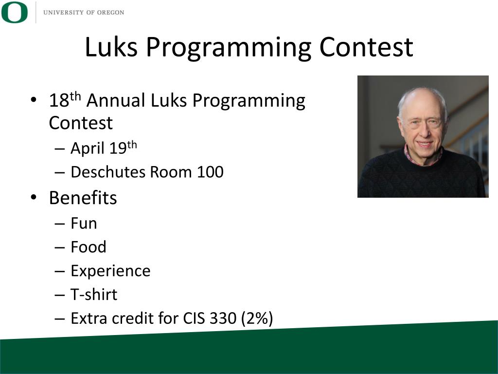 Luks Programming Contest • 18th Annual Luks Programming Contest • April 19th • Deschutes Room 100 • Benefits • Fun • Food • Experience • T-shirt • Extra credit for CIS 330 (2%)