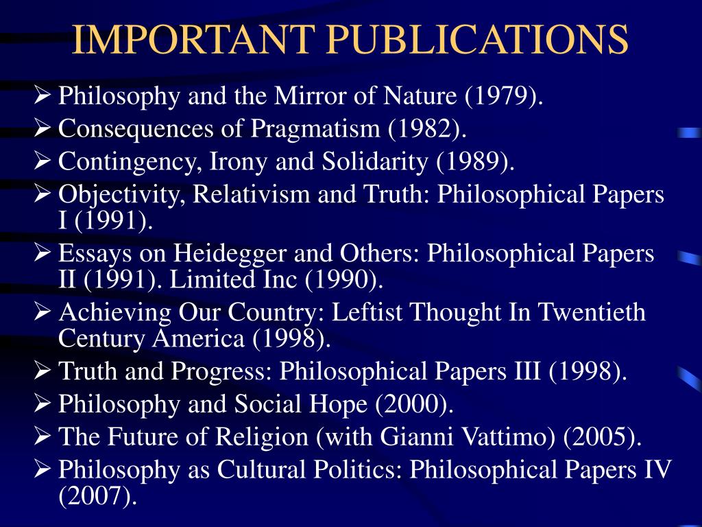 IMPORTANT PUBLICATIONS • Philosophy and the Mirror of Nature (1979). • Consequences of Pragmatism (1982). • Contingency, Irony and Solidarity (1989). • Objectivity, Relativism and Truth: Philosophical Papers I (1991). • Essays on Heidegger and Others: Philosophical Papers II (1991). Limited Inc (1990). • Achieving Our Country: Leftist Thought In Twentieth Century America (1998). • Truth and Progress: Philosophical Papers III (1998). • Philosophy and Social Hope (2000). • The Future of Religion (with Gianni Vattimo) (2005). • Philosophy as Cultural Politics: Philosophical Papers IV (2007).