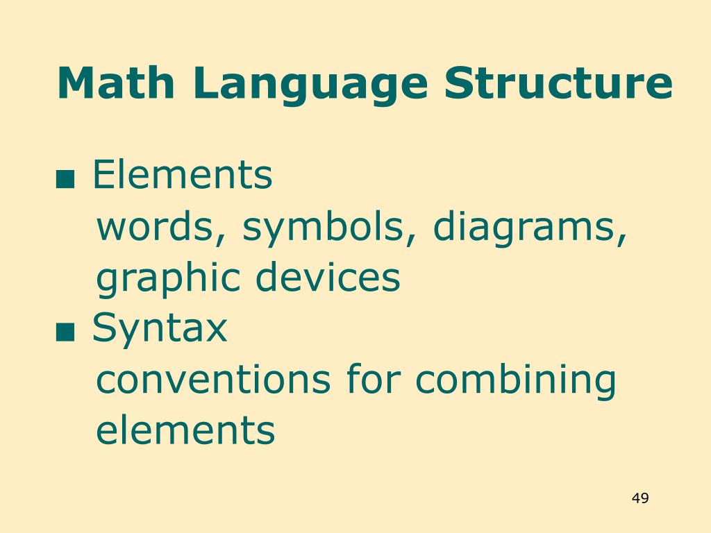 Math Language Structure • ■ Elements • words, symbols, diagrams, • graphic devices • ■ Syntax • conventions for combining • elements
