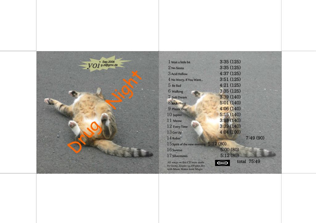 1 Wait a little bit 3:35 (125) 2 No Siesta 3:35 (125) 3 Acid Hollow 4:37 (125) 4 No Worry, If You Want… 3:51 (125) 5 Be Bad 4:21 (125) 6 Walking 3:35 (125) 7 Soft Dream 3:39 (140) 8 ex & Hopp 5:01 (140) 9 Plastic Dog 4:06 (140) 10 Jupiter 5:15 (140) 11 Meow 3:13 (140) 12 Every Time 3:39 (140) 13 Get Up 4:04 (100) 14 Robin 7:49 (90) 15 Spirit of the new morning 5:12 (80) 16 Sunrise 5:00 (80) 17 Silvermoon 5:12 (80) total 75:49 yoi Sep.2006 g.zi@gmx.de Drug Night All songs on this CD were made by Georg Ziegler (g.zi@gmx.de) with Music Maker from Magix