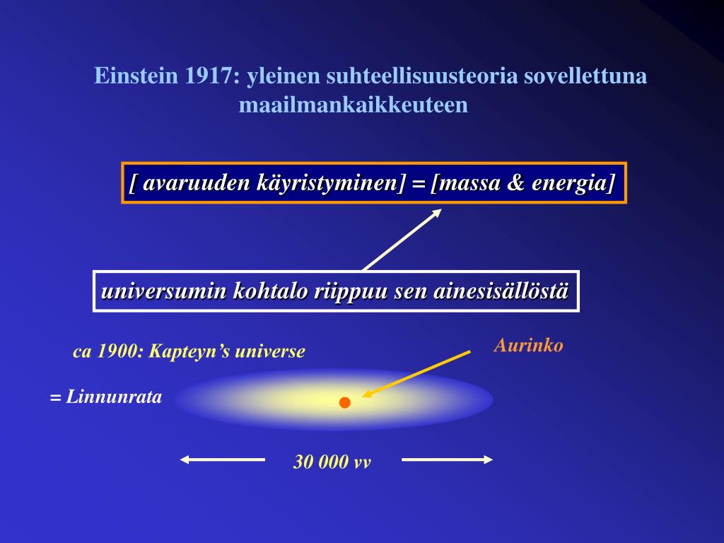 Einstein 1917: yleinen suhteellisuusteoria sovellettuna maailmankaikkeuteen [ avaruuden käyristyminen] = [massa & energia] universumin kohtalo riippuu sen ainesisällöstä Aurinko ca 1900: Kapteyn’s universe = Linnunrata 30 000 vv