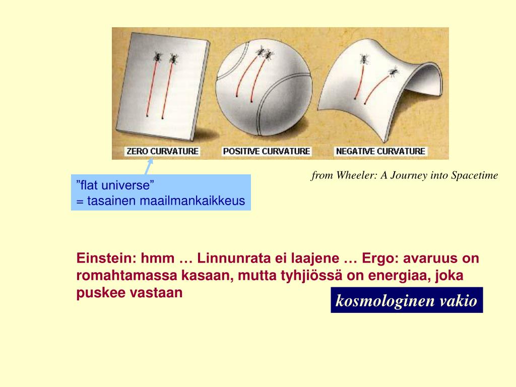 Einstein: hmm … Linnunrata ei laajene … Ergo: avaruus on romahtamassa kasaan, mutta tyhjiössä on energiaa, joka puskee vastaan kosmologinen vakio from Wheeler: A Journey into Spacetime ”flat universe” = tasainen maailmankaikkeus