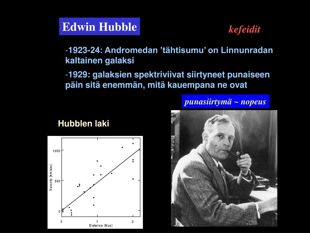 Edwin Hubble kefeidit • 1923-24: Andromedan ’tähtisumu’ on Linnunradan • kaltainen galaksi • 1929: galaksien spektriviivat siirtyneet punaiseen • päin sitä enemmän, mitä kauempana ne ovat punasiirtymä ~ nopeus Hubblen laki AVARUUS LAAJENEE