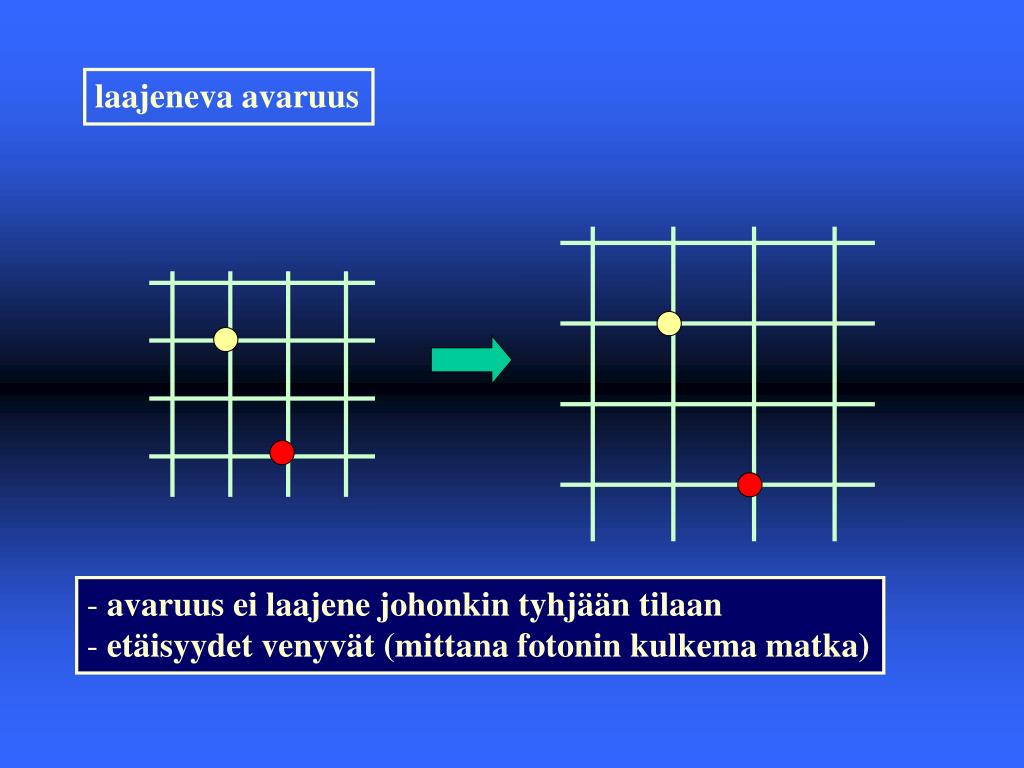 laajeneva avaruus • avaruus ei laajene johonkin tyhjään tilaan • etäisyydet venyvät (mittana fotonin kulkema matka)