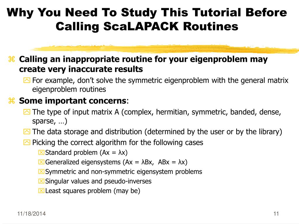 Why You Need To Study This Tutorial Before Calling ScaLAPACK Routines • Calling an inappropriate routine for your eigenproblem may create very inaccurate results • For example, don’t solve the symmetric eigenproblem with the general matrix eigenproblem routines • Some important concerns: • The type of input matrix A (complex, hermitian, symmetric, banded, dense, sparse, …) • The data storage and distribution (determined by the user or by the library) • Picking the correct algorithm for the following cases • Standard problem (Ax = λx) • Generalized eigensystems (Ax = λBx, ABx = λx) • Symmetric and non-symmetric eigensystem problems • Singular values and pseudo-inverses • Least squares problem (may be)