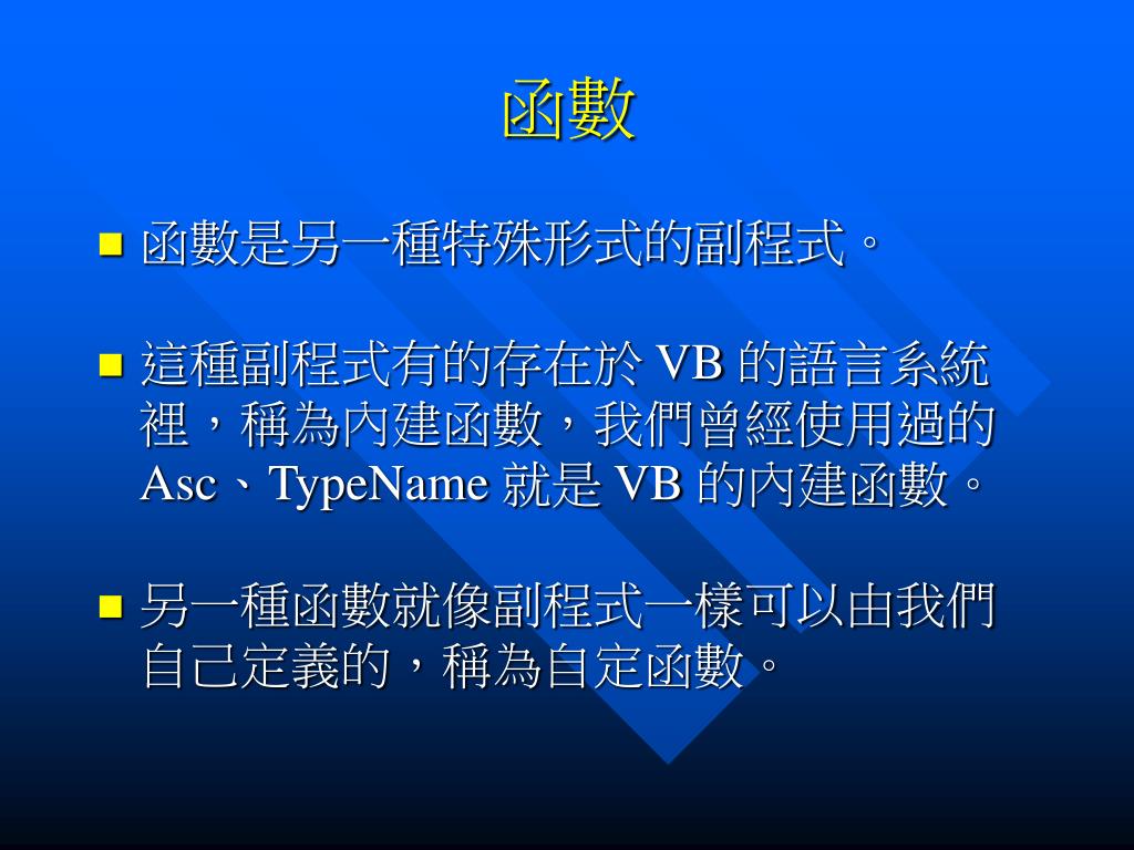 函數 • 函數是另一種特殊形式的副程式。 • 這種副程式有的存在於 VB 的語言系統裡,稱為內建函數,我們曾經使用過的 Asc、TypeName 就是 VB 的內建函數。 • 另一種函數就像副程式一樣可以由我們自己定義的,稱為自定函數。
