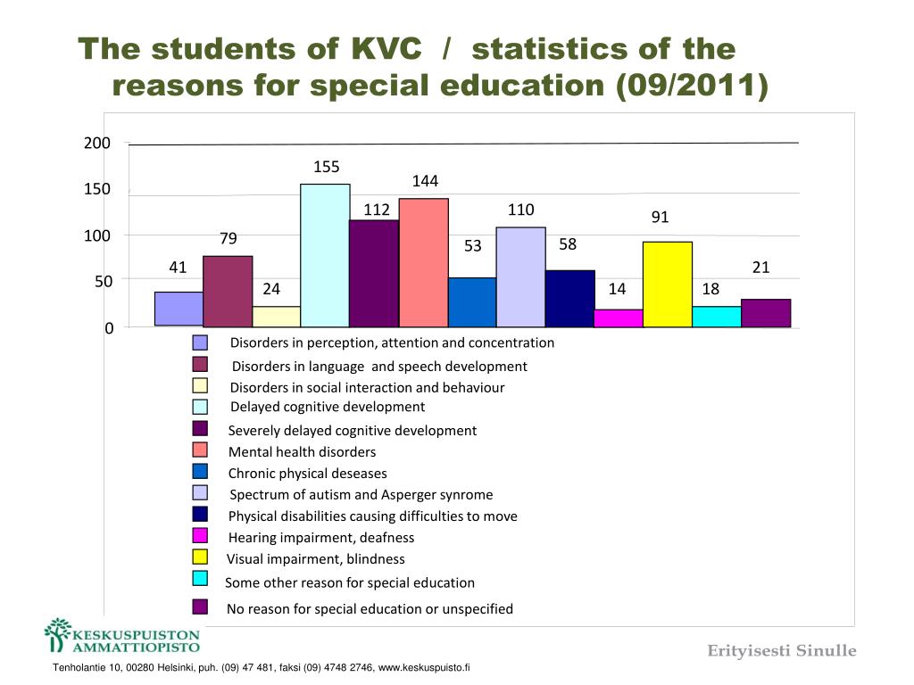 The students of KVC / statistics of the reasons for special education (09/2011) 200 155 144 150 112 110 91 100 79 58 53 41 21 50 24 14 18 0 Disorders in perception, attention and concentration Disorders in language and speech development Disorders in social interaction and behaviour Delayed cognitive development Severely delayed cognitive development Mental health disorders Chronic physical deseases Spectrum of autism and Asperger synrome Physical disabilities causing difficulties to move Hearing impairment, deafness Visual impairment, blindness Some other reason for special education No reason for special education or unspecified Tenholantie 10, 00280 Helsinki, puh. (09) 47 481, faksi (09) 4748 2746, www.keskuspuisto.fi