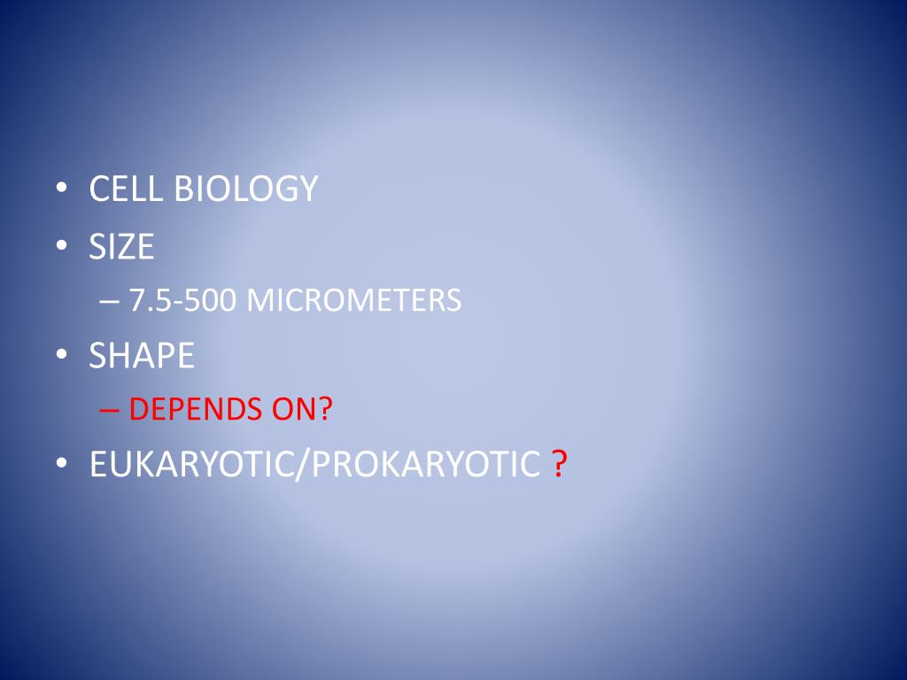 CELL BIOLOGY • SIZE • 7.5-500 MICROMETERS • SHAPE • DEPENDS ON? • EUKARYOTIC/PROKARYOTIC ?