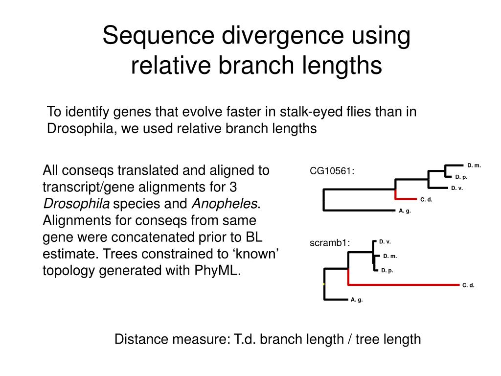 Sequence divergence using relative branch lengths To identify genes that evolve faster in stalk-eyed flies than in Drosophila, we used relative branch lengths All conseqs translated and aligned to transcript/gene alignments for 3 Drosophila species and Anopheles. Alignments for conseqs from same gene were concatenated prior to BL estimate. Trees constrained to ‘known’ topology generated with PhyML. D. m. CG10561: D. p. D. v. C. d. A. g. scramb1: D. v. D. m. D. p. C. d. A. g. Distance measure: T.d. branch length / tree length