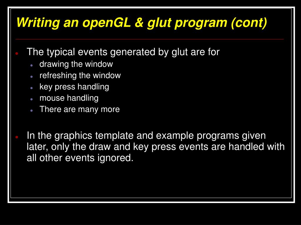 Writing an openGL & glut program (cont) • The typical events generated by glut are for • drawing the window • refreshing the window • key press handling • mouse handling • There are many more • In the graphics template and example programs given later, only the draw and key press events are handled with all other events ignored.