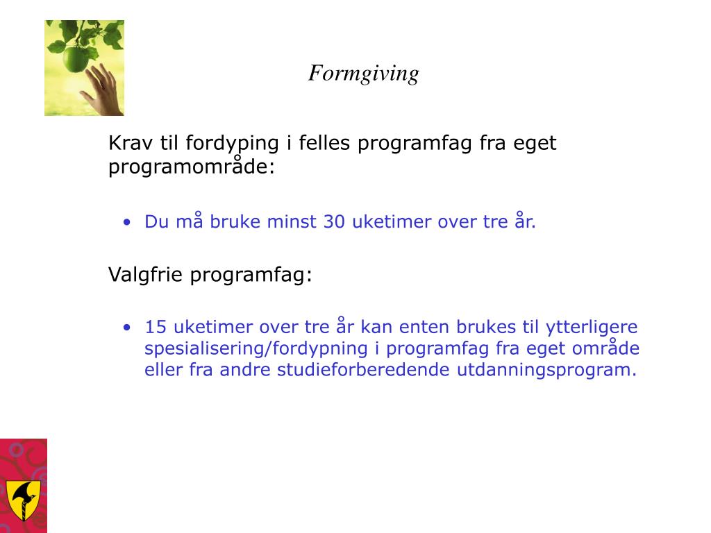 Formgiving Krav til fordyping i felles programfag fra eget programområde: • Du må bruke minst 30 uketimer over tre år. Valgfrie programfag: • 15 uketimer over tre år kan enten brukes til ytterligere spesialisering/fordypning i programfag fra eget område eller fra andre studieforberedende utdanningsprogram.