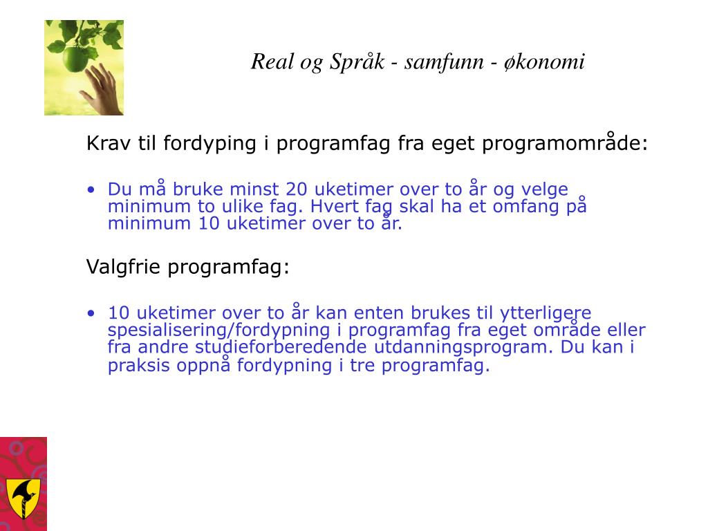 Real og Språk - samfunn - økonomi Krav til fordyping i programfag fra eget programområde: • Du må bruke minst 20 uketimer over to år og velge minimum to ulike fag. Hvert fag skal ha et omfang på minimum 10 uketimer over to år. Valgfrie programfag: • 10 uketimer over to år kan enten brukes til ytterligere spesialisering/fordypning i programfag fra eget område eller fra andre studieforberedende utdanningsprogram. Du kan i praksis oppnå fordypning i tre programfag.