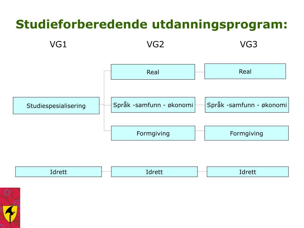 Studieforberedende utdanningsprogram: VG2 VG3 Real Real VG1 Studiespesialisering Språk -samfunn - økonomi Språk -samfunn - økonomi Formgiving Formgiving Idrett Idrett Idrett