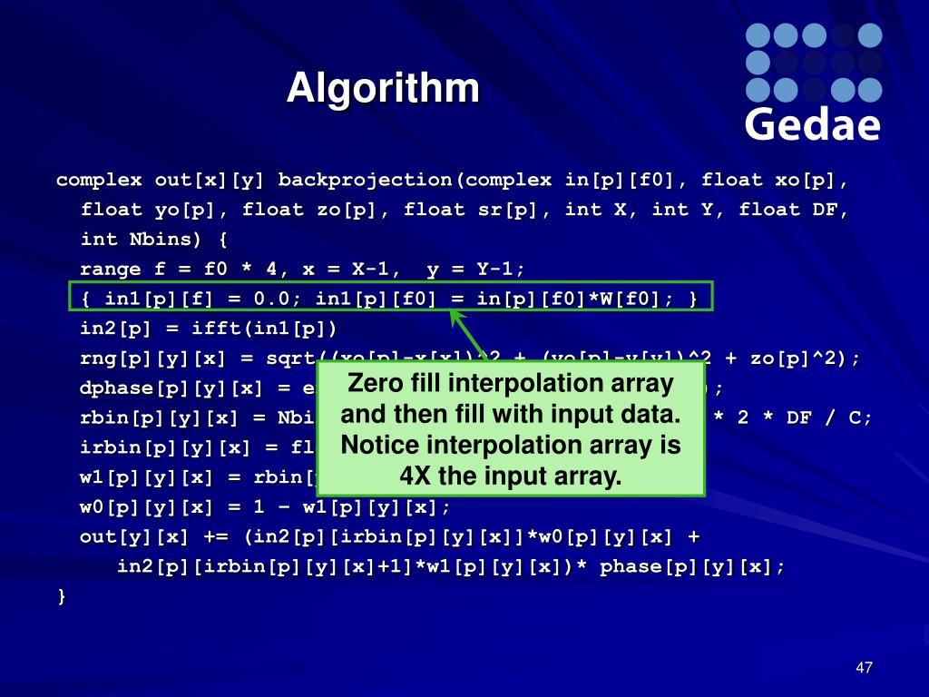 Algorithm complex out[x][y] backprojection(complex in[p][f0], float xo[p], float yo[p], float zo[p], float sr[p], int X, int Y, float DF, intNbins) { range f = f0 * 4, x = X-1, y = Y-1; { in1[p][f] = 0.0; in1[p][f0] = in[p][f0]*W[f0]; } in2[p] = ifft(in1[p]) rng[p][y][x] = sqrt((xo[p]-x[x])^2 + (yo[p]-y[y])^2 + zo[p]^2); dphase[p][y][x] = exp(i*4*PI/C*f0[p]* rng[p][y][x]); rbin[p][y][x] = Nbins * (rng[p][y][x] - rstart[p]) * 2 * DF / C; irbin[p][y][x] = floor(rbin[p][y][x]); w1[p][y][x] = rbin[p][y][x] - irbin[p][y][x]; w0[p][y][x] = 1 – w1[p][y][x]; out[y][x] += (in2[p][irbin[p][y][x]]*w0[p][y][x] + in2[p][irbin[p][y][x]+1]*w1[p][y][x])* phase[p][y][x]; } Zero fill interpolation array and then fill with input data. Notice interpolation array is 4X the input array.