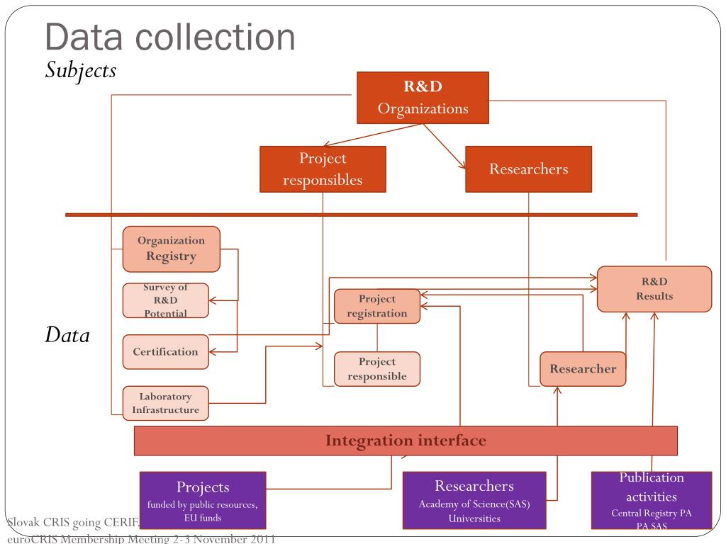 Datacollection R&D Organizations Subjects Data Project responsibles Researchers Organization Registry R&D Results Surveyof R&D Potential Project registration Certification Project responsible Researcher LaboratoryInfrastructure Integrationinterface Projects funded by publicresources, EU funds Researchers Academyof Science(SAS) Universities Publicationactivities CentralRegistry PA PA SAS Slovak CRIS going CERIF. euroCRIS Membership Meeting 2-3 November 2011