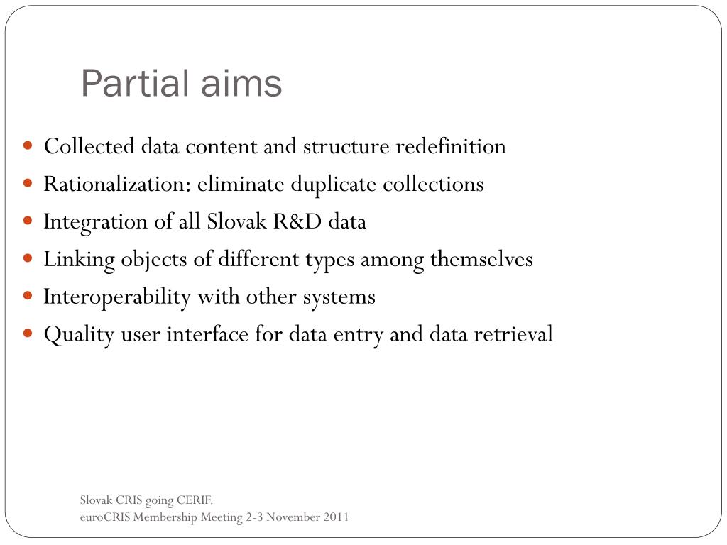 Partial aims • Collected data content and structure redefinition • Rationalization: eliminate duplicate collections • Integration of all Slovak R&D data • Linking objects of different types among themselves • Interoperability with other systems • Quality user interface for data entry and data retrieval Slovak CRIS going CERIF. euroCRIS Membership Meeting 2-3 November 2011
