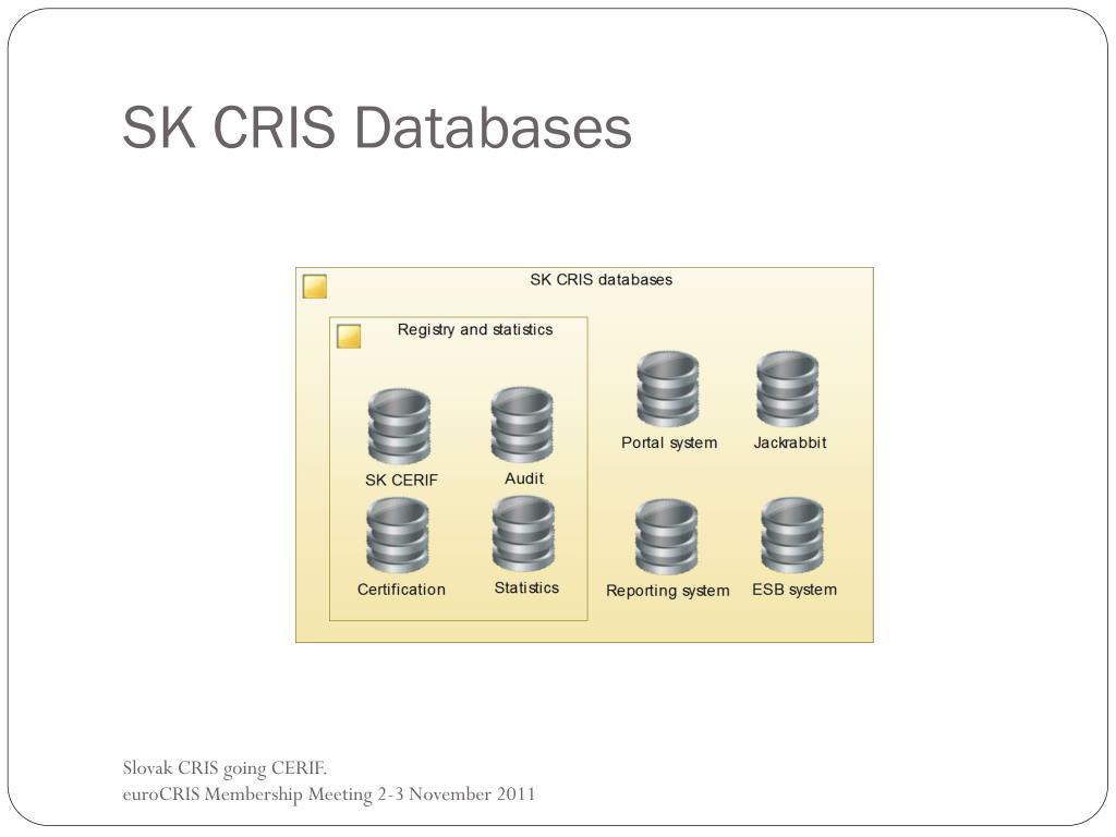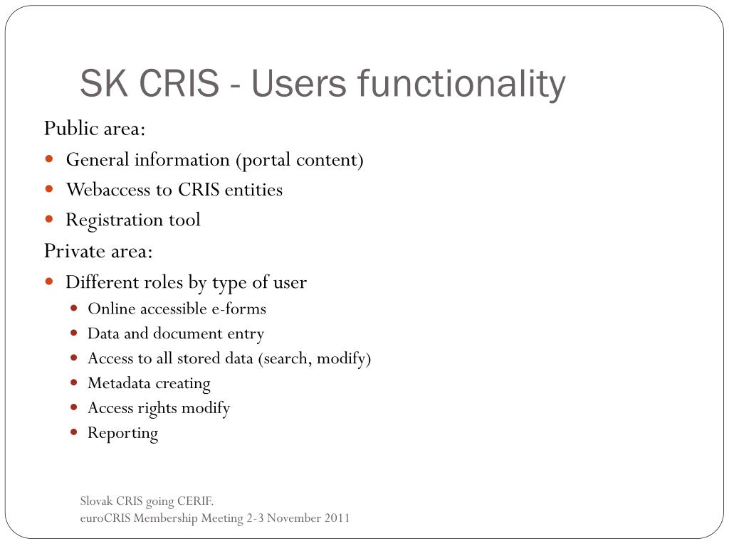 Intention of creating SK CRIS New system will: • offer broad and detailed map of Slovak science • provide the information in mutual relations to all target groups • contain the possibility of interoperability with similar systems across EU countries • use data format CERIF Slovak CRIS going CERIF. euroCRIS Membership Meeting 2-3 November 2011
