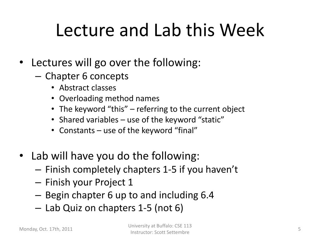 Lecture and Lab this Week • Lectures will go over the following: • Chapter 6 concepts • Abstract classes • Overloading method names • The keyword “this” – referring to the current object • Shared variables – use of the keyword “static” • Constants – use of the keyword “final” • Lab will have you do the following: • Finish completely chapters 1-5 if you haven’t • Finish your Project 1 • Begin chapter 6 up to and including 6.4 • Lab Quiz on chapters 1-5 (not 6) University at Buffalo: CSE 113 Instructor: Scott Settembre