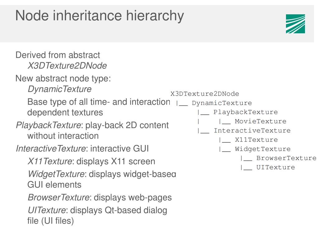 Node inheritance hierarchy • DerivedfromabstractX3DTexture2DNode • New abstractnode type: DynamicTexture • Base type of all time- andinteraction-dependenttextures • PlaybackTexture: play-back 2D contentwithoutinteraction • InteractiveTexture: interactive GUI • X11Texture: displays X11 screen • WidgetTexture: displayswidget-based GUI elements • BrowserTexture: displays web-pages • UITexture: displaysQt-baseddialogfile (UI files)