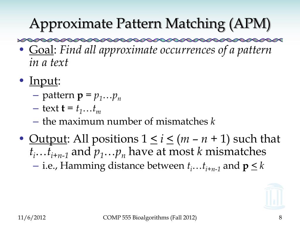 Approximate Pattern Matching (APM) • Goal: Find all approximate occurrences of a pattern in a text • Input: • pattern p = p1…pn • text t = t1…tm • the maximum number of mismatches k • Output: All positions 1 <i< (m – n +1) such that ti…ti+n-1 and p1…pn have at most k mismatches • i.e., Hamming distance between ti…ti+n-1 and p <k COMP 555 Bioalgorithms (Fall 2012)