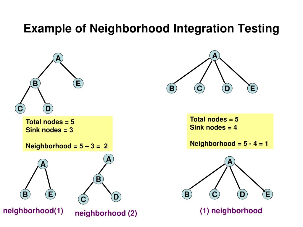 Example of Neighborhood Integration Testing A A B E B C D E C D Total nodes = 5 Sink nodes = 4 Neighborhood = 5 - 4 = 1 Total nodes = 5 Sink nodes = 3 Neighborhood = 5 – 3 = 2 A A A B B E B C D E D C neighborhood(1) (1) neighborhood neighborhood (2)