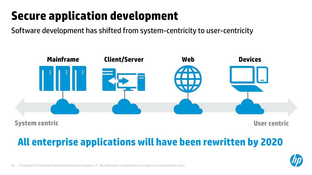 Secure application development Software development has shifted from system-centricity to user-centricity • All enterprise applications will have been rewritten by 2020 Mainframe Client/Server Web Devices System centric User centric