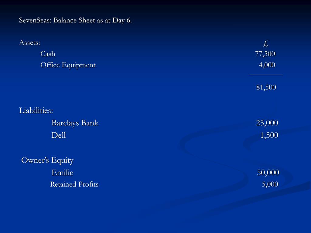 SevenSeas: Balance Sheet as at Day 6. Assets: £ Cash 77,500 Office Equipment 4,000 81,500 Liabilities: Barclays Bank 25,000 Dell 1,500 Owner’s Equity Emilie 50,000 Retained Profits 5,000