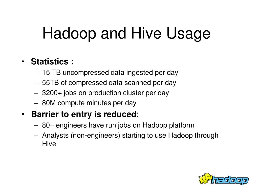 Hadoop and Hive Usage • Statistics : • 15 TB uncompressed data ingested per day • 55TB of compressed data scanned per day • 3200+ jobs on production cluster per day • 80M compute minutes per day • Barrier to entry is reduced: • 80+ engineers have run jobs on Hadoop platform • Analysts (non-engineers) starting to use Hadoop through Hive