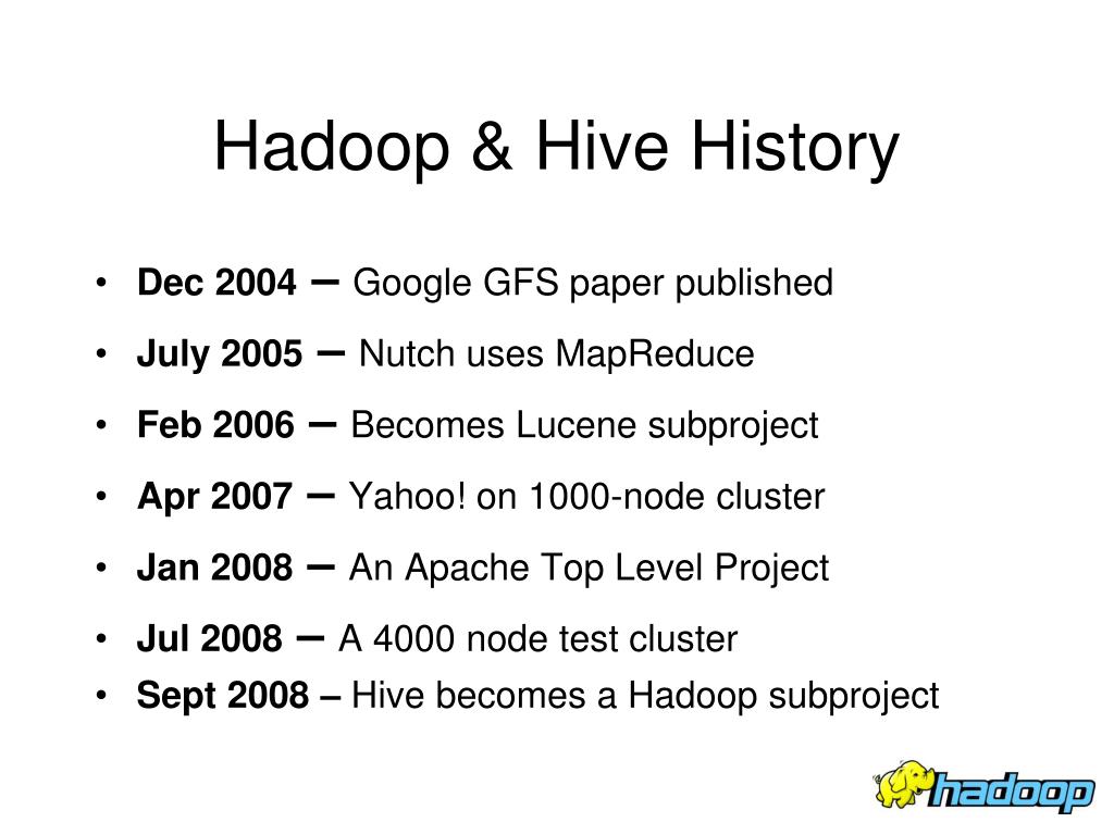 Hadoop & Hive History • Dec 2004 – Google GFS paper published • July 2005 – Nutch uses MapReduce • Feb 2006 – Becomes Lucene subproject • Apr 2007 – Yahoo! on 1000-node cluster • Jan 2008 – An Apache Top Level Project • Jul 2008 – A 4000 node test cluster • Sept 2008 – Hive becomes a Hadoop subproject