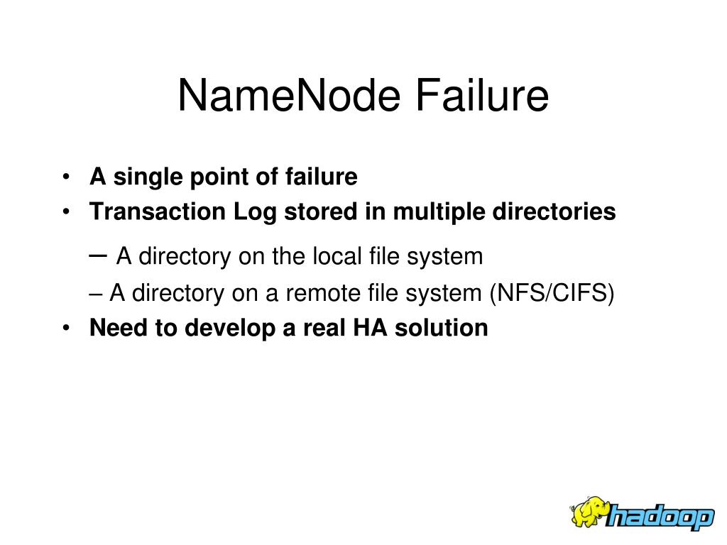 NameNode Failure • A single point of failure • Transaction Log stored in multiple directories – A directory on the local file system – A directory on a remote file system (NFS/CIFS) • Need to develop a real HA solution