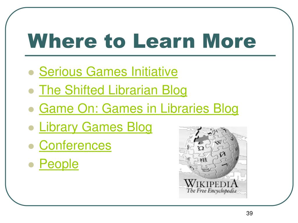 Where to Learn More • Serious Games Initiative • The Shifted Librarian Blog • Game On: Games in Libraries Blog • Library Games Blog • Conferences • People