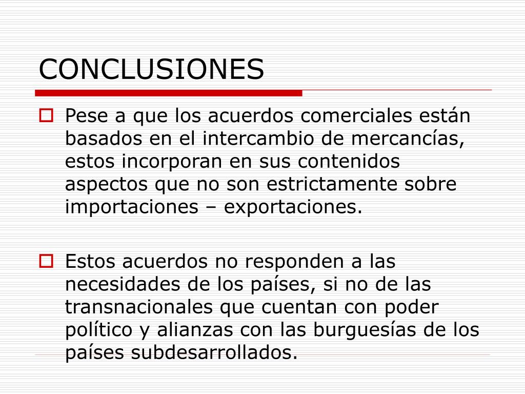 CONCLUSIONES • Pese a que los acuerdos comerciales están basados en el intercambio de mercancías, estos incorporan en sus contenidos aspectos que no son estrictamente sobre importaciones – exportaciones. • Estos acuerdos no responden a las necesidades de los países, si no de las transnacionales que cuentan con poder político y alianzas con las burguesías de los países subdesarrollados.