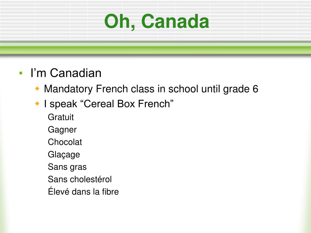Oh, Canada • I’m Canadian • Mandatory French class in school until grade 6 • I speak “Cereal Box French” Gratuit Gagner Chocolat Glaçage Sans gras Sans cholestérol Élevé dans la fibre