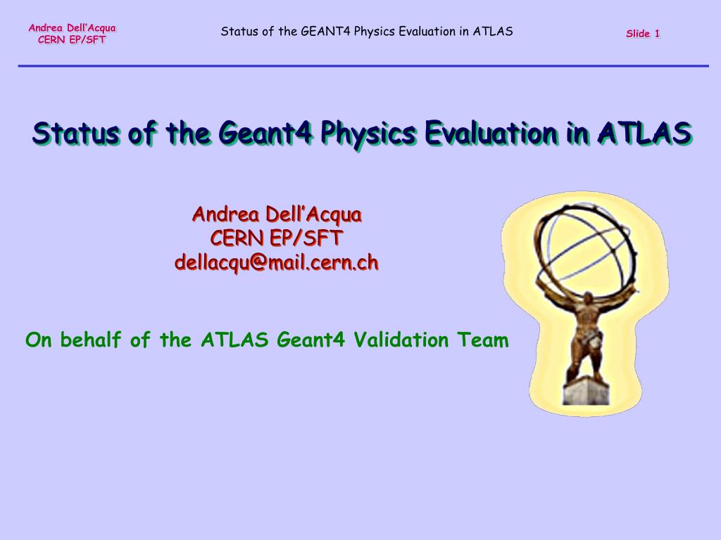Status of the Geant4 Physics Evaluation in ATLAS Andrea Dell’Acqua CERN EP/SFT dellacqu@mail.cern.ch On behalf of the ATLAS Geant4 Validation Team