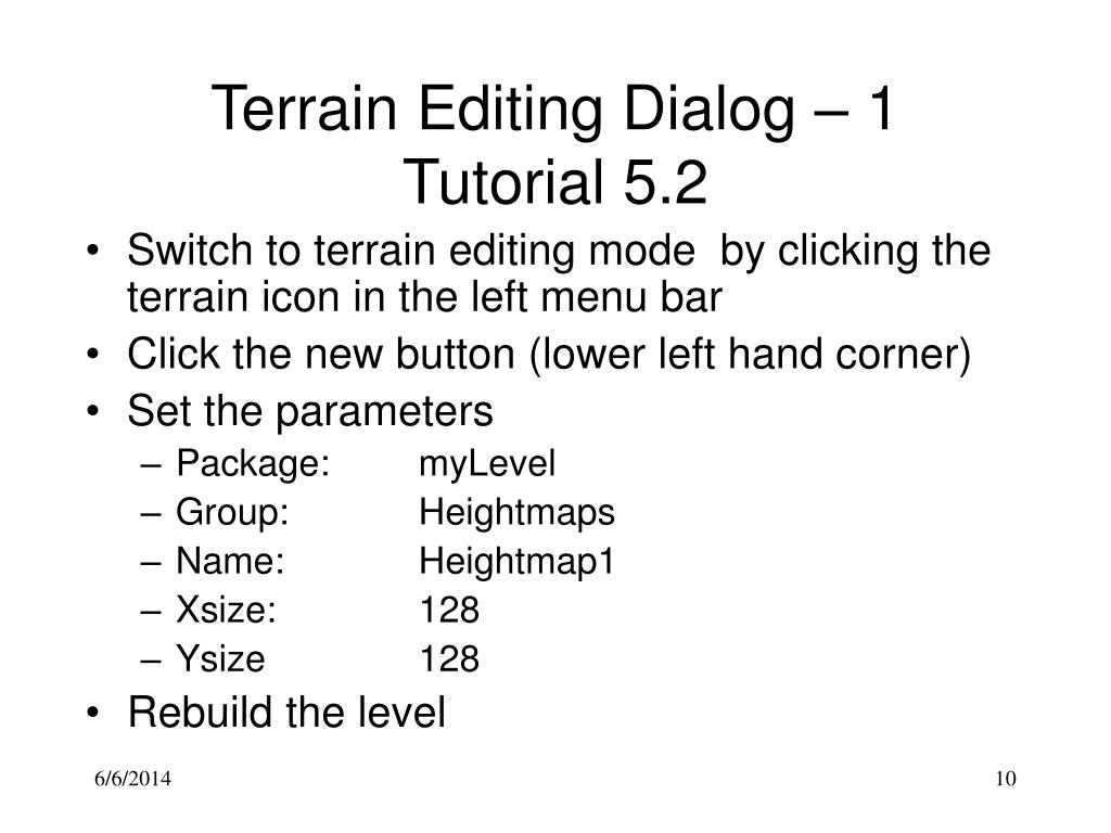 Terrain Editing Dialog – 1Tutorial 5.2 • Switch to terrain editing mode by clicking the terrain icon in the left menu bar • Click the new button (lower left hand corner) • Set the parameters • Package: myLevel • Group: Heightmaps • Name: Heightmap1 • Xsize: 128 • Ysize 128 • Rebuild the level