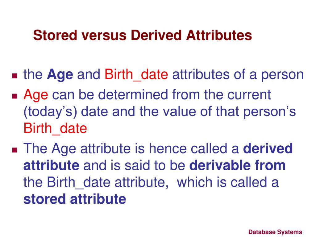 Stored versus Derived Attributes • the Age and Birth_date attributes of a person • Age can be determined from the current (today’s) date and the value of that person’s Birth_date • The Age attribute is hence called a derived attribute and is said to be derivable from the Birth_date attribute, which is called a stored attribute