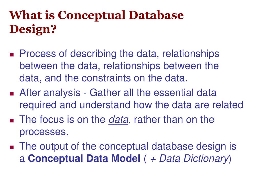 What is Conceptual Database Design? • Process of describing the data, relationships between the data, relationships between the data, and the constraints on the data. • After analysis - Gather all the essential data required and understand how the data are related • The focus is on the data, rather than on the processes. • The output of the conceptual database design is a Conceptual Data Model ( + Data Dictionary)