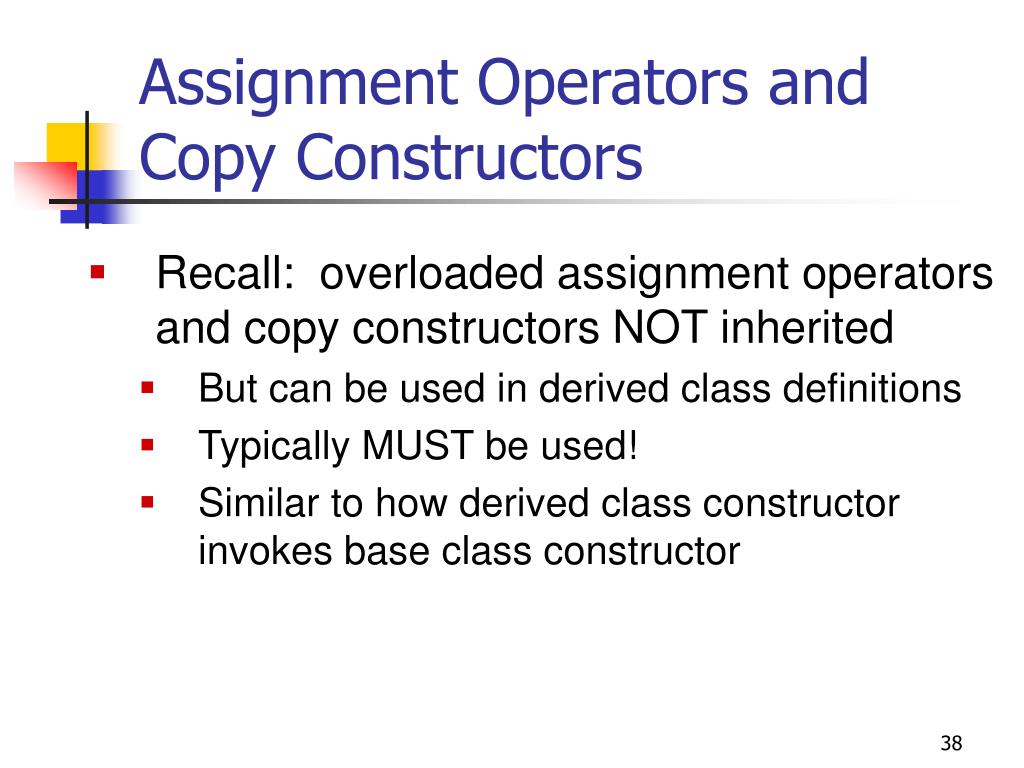 Assignment Operators and Copy Constructors • Recall: overloaded assignment operatorsand copy constructors NOT inherited • But can be used in derived class definitions • Typically MUST be used! • Similar to how derived class constructorinvokes base class constructor