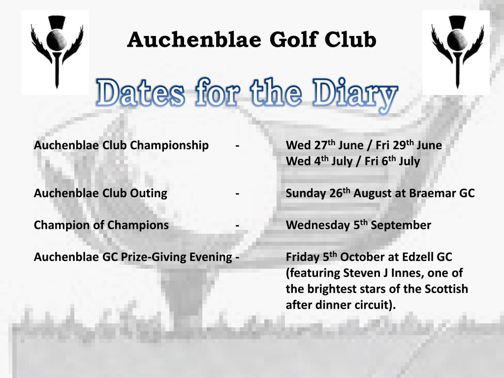 Auchenblae Golf Club Dates for the Diary Auchenblae Club Championship - Wed 27th June / Fri 29th June Wed 4th July / Fri 6th July Auchenblae Club Outing - Sunday 26th August at Braemar GC Champion of Champions - Wednesday 5th September Auchenblae GC Prize-Giving Evening - Friday 5th October at Edzell GC (featuring Steven J Innes, one of the brightest stars of the Scottish after dinner circuit).
