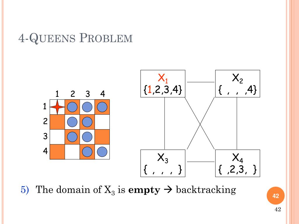 X1 {1,2,3,4} X2 {1,2,3,4} 1 2 3 4 1 2 3 4 X3 {1,2,3,4} X4 {1,2,3,4} 4-Queens Problem • The algorithm calls AC3, which eliminates 3 from the domain of X2, and 2 from the domain of X3, and 4 from the domain of X3 41