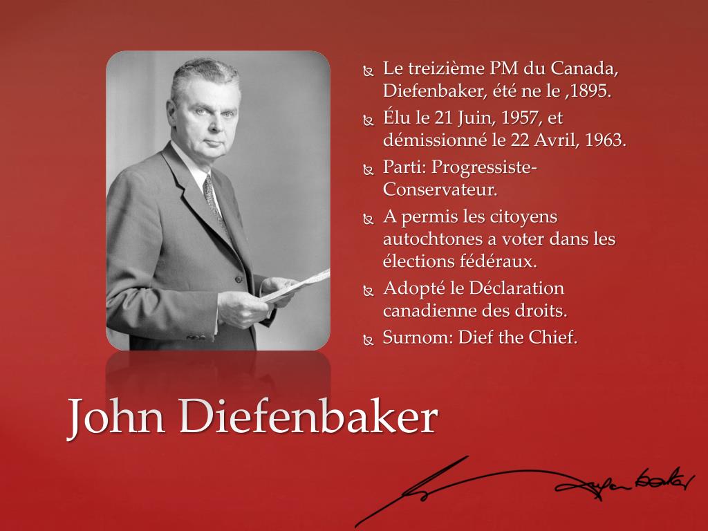 Le treizième PM du Canada, Diefenbaker, été ne le ,1895. • Élu le 21 Juin, 1957, et démissionné le 22 Avril, 1963. • Parti: Progressiste-Conservateur. • A permis les citoyens autochtones a voter dans les élections fédéraux. • Adopté le Déclaration canadienne des droits. • Surnom: Dief the Chief. John Diefenbaker